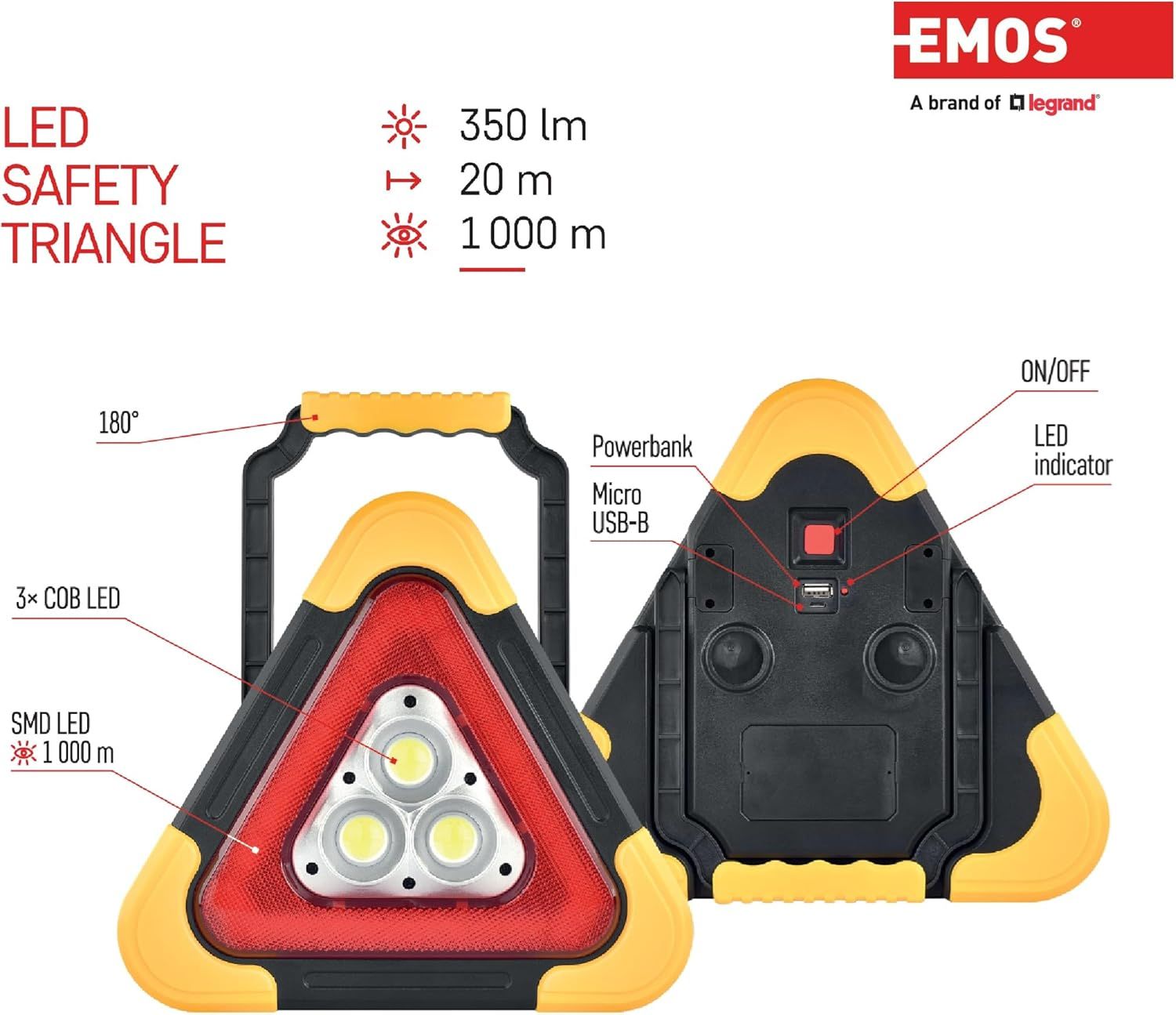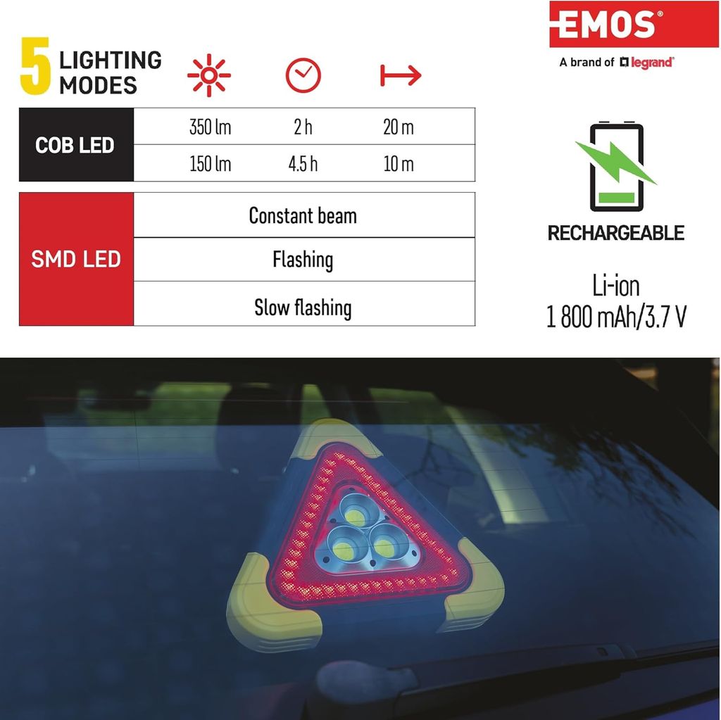 - 2 light sources: the safety triangle uses advanced COB LED technology with brightness of up to 350 lumens and beam distance of up to 20 meters (depending on the mode selected). The red SMD LEDs ensure better visibility and your safety