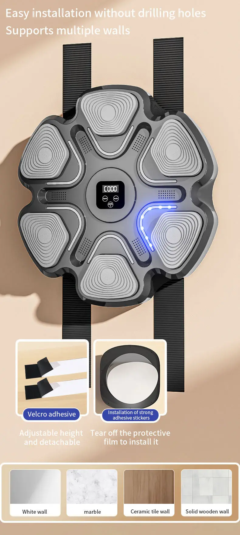 Easily install the boxing target on the wall without drilling holes. Compact and space-saving, it is suitable for various wall surfaces such as wooden boards, marble, ceramic tiles, and white walls.