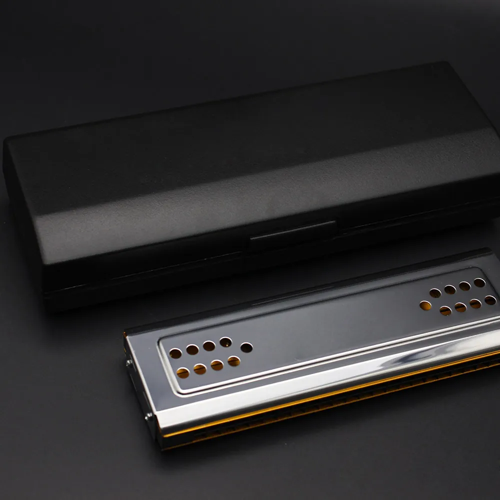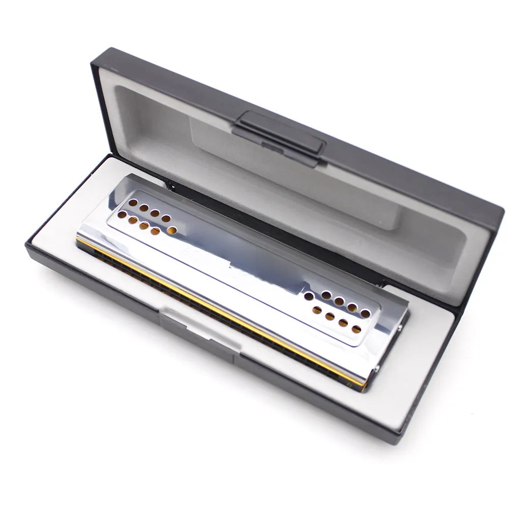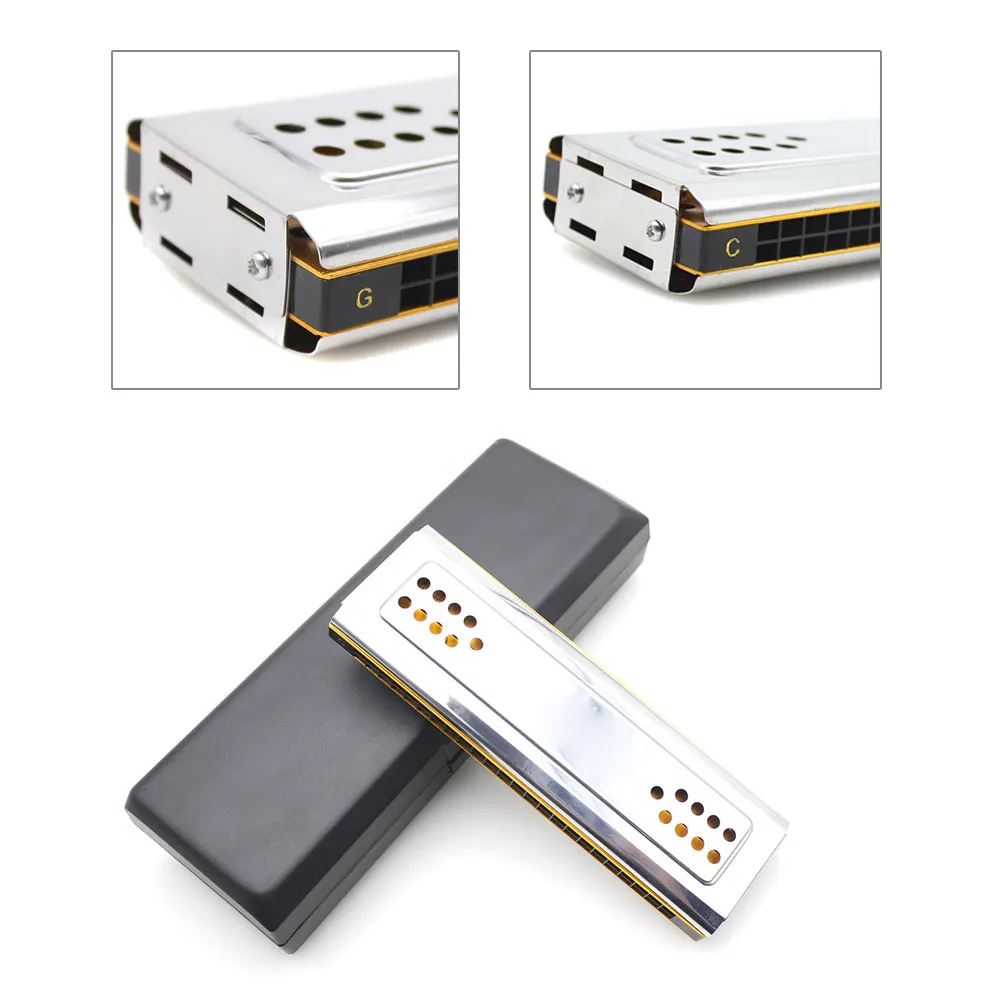 2-in-1 (dual-sided)design, has key of both C & G.Each side has 24 holes and 48 reeds.Cover is made of chrome-plating copper, good durability.Copper reeds and plate, come out with a pretty good sound.Padded box and a piece of cloth keep harmonica safe and clean.Ideal for music lovers.