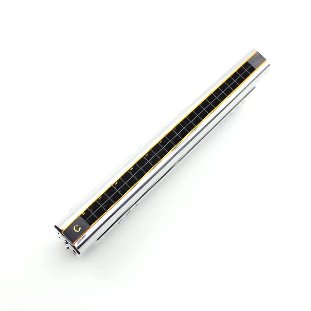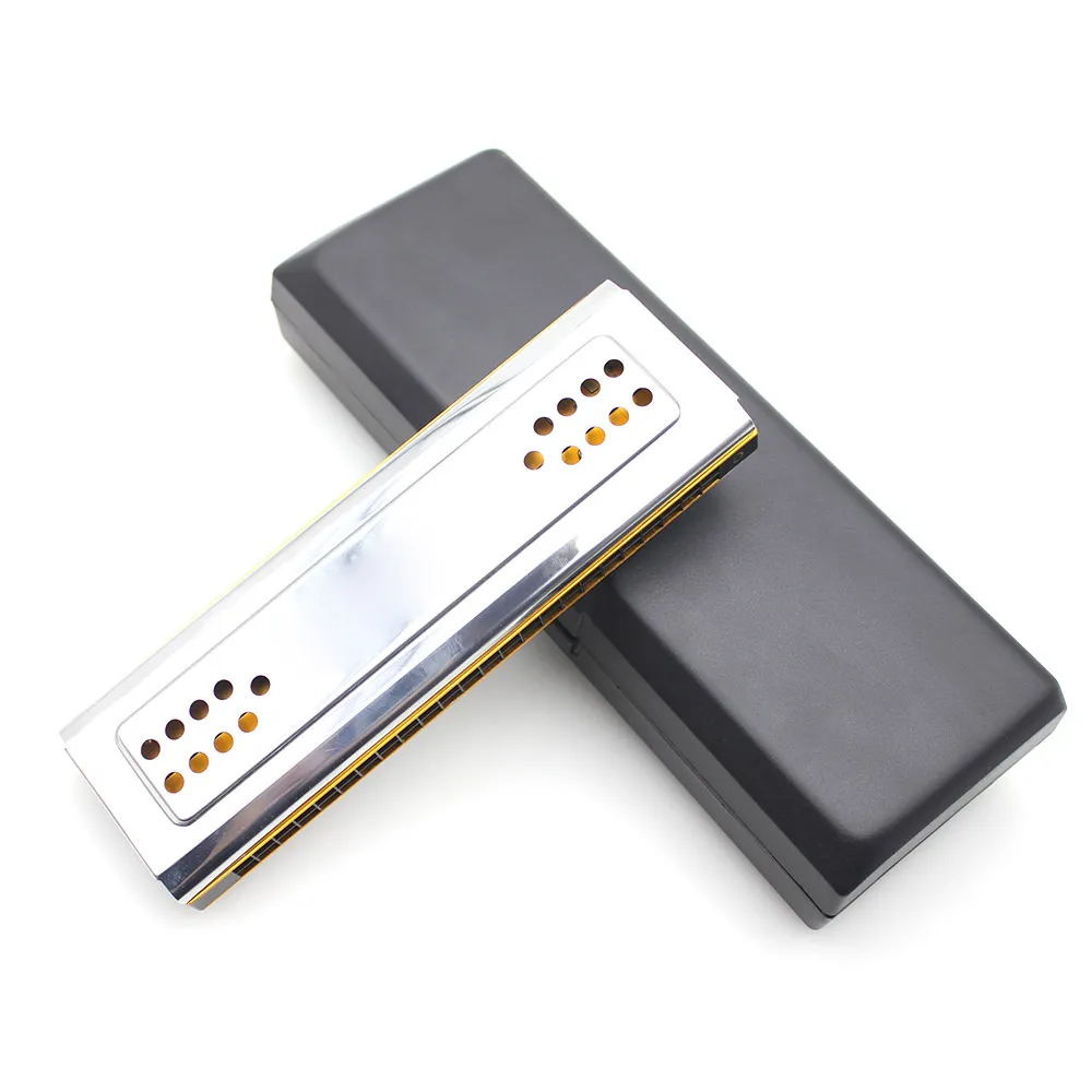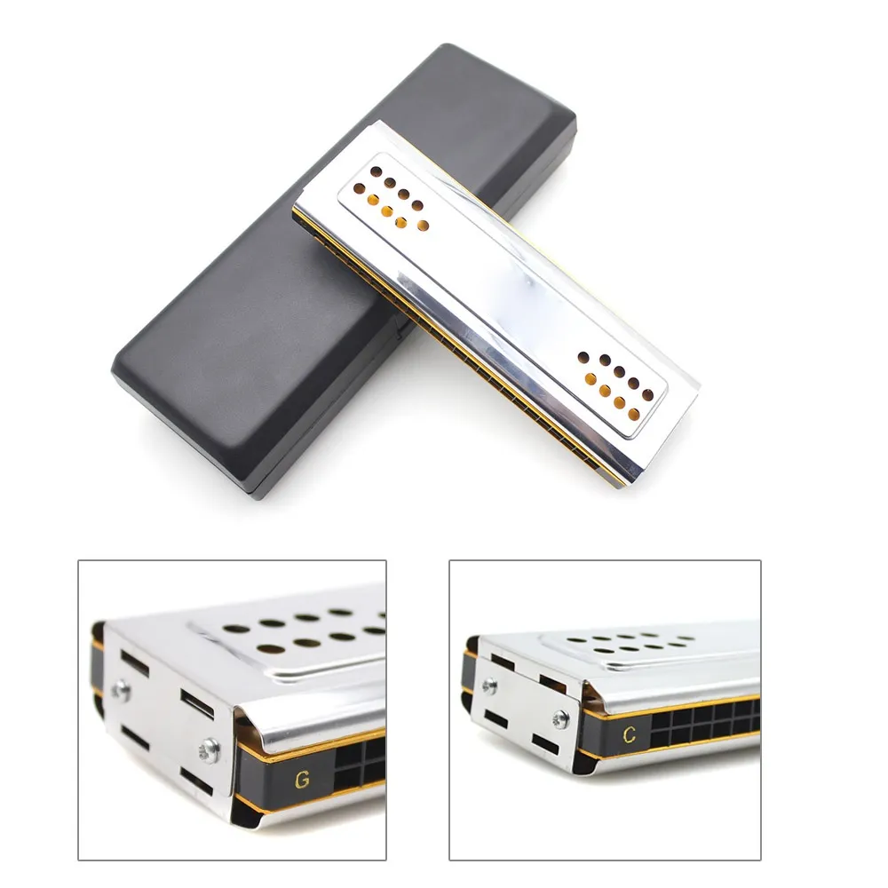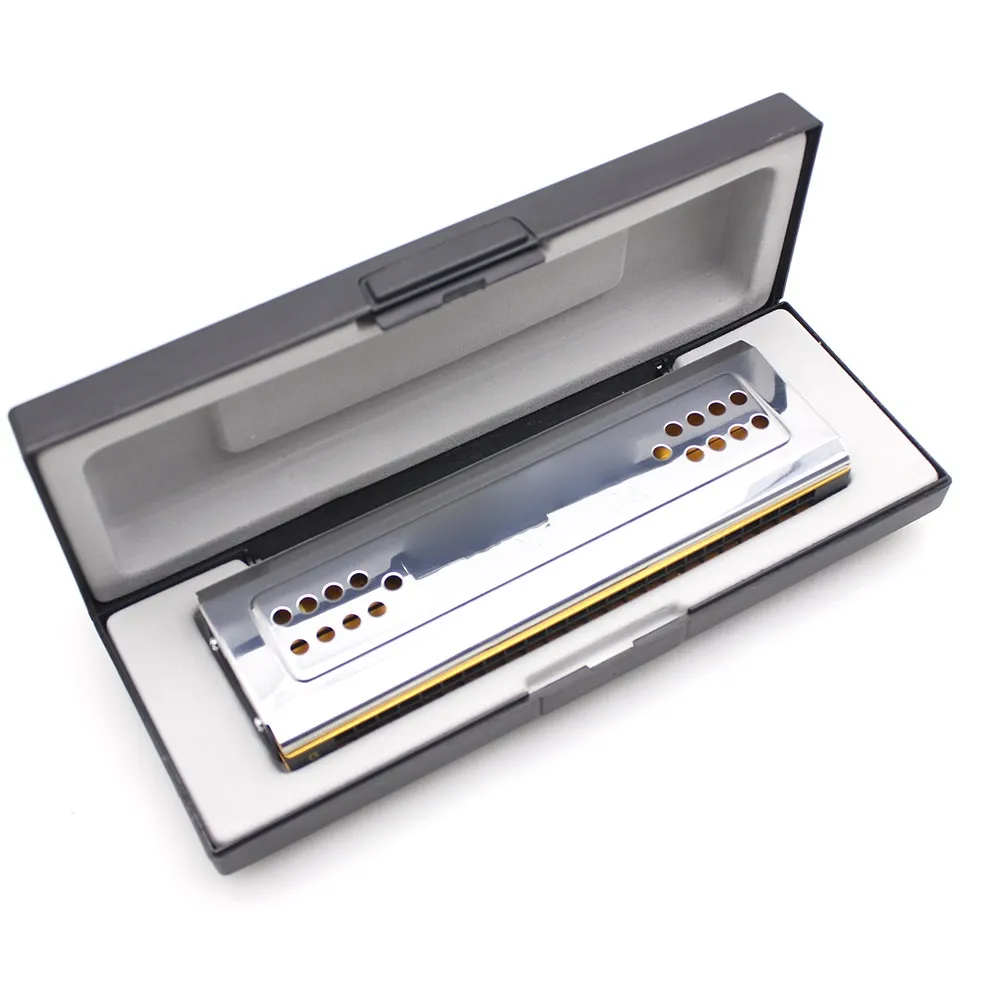2-in-1 (dual-sided)design, has key of both C & G.Each side has 24 holes and 48 reeds.Cover is made of chrome-plating copper, good durability.Copper reeds and plate, come out with a pretty good sound.Padded box and a piece of cloth keep harmonica safe and clean.Ideal for music lovers.