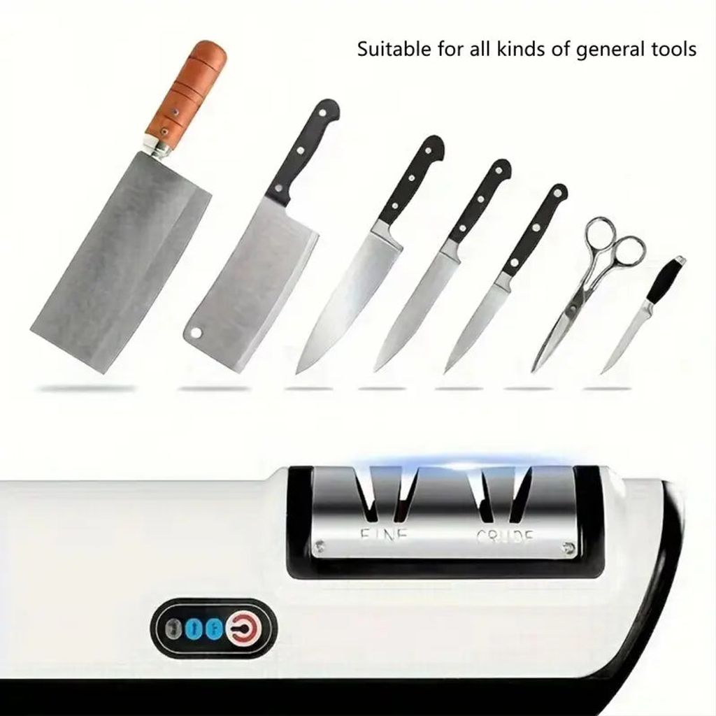 【Multifunctional Use】: Equipped for versatility, this electric knife sharpener caters to a wide range of kitchen knives, ensuring sharpness for every cut.【Durable Construction】: Crafted with a robust combination of metal and plastic, this sharpener is designed to withstand the test of time in any kitchen environment.【1200mAh Battery】: The inclusion of a potent 1200mAh battery allows for extended use, making it a go-to gadget for all sharpening needs without constant recharging.【Automatic Operation】: Streamlining knife maintenance, this electric sharpener's fully automatic operation removes the guesswork, providing precision sharpening with minimal effort.【Compact Design】: Its small footprint ensures it can be easily accommodated in any kitchen, saving space without sacrificing performance, making it an ideal household tool.