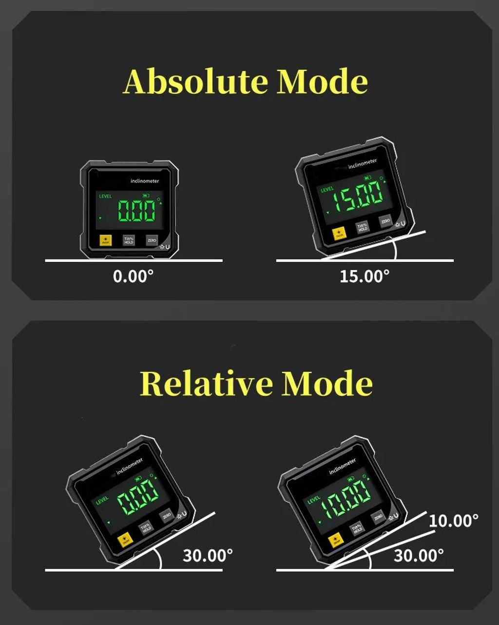 DUAL MODE PRECISION MEASUREMENT – Absolute Mode ensures precise leveling with a reference line, while Relative Mode allows zeroing at any angle for versatile measurements, ideal for professionals in construction, carpentry, and engineering.