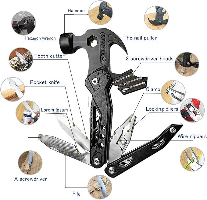 The survival hammer multitool is a 14-in-1 tool that includes a hammer, nail puller, various screwdriver holes, hex wrench, serrated knife, steel file, slotted screwdriver, Philips screwdriver, flathead screwdriver, regular pliers, needle-nose pliers, bottle opener, knife, and wire cutter. This tool is perfect for all your daily maintenance, repair, and outdoor activity needs