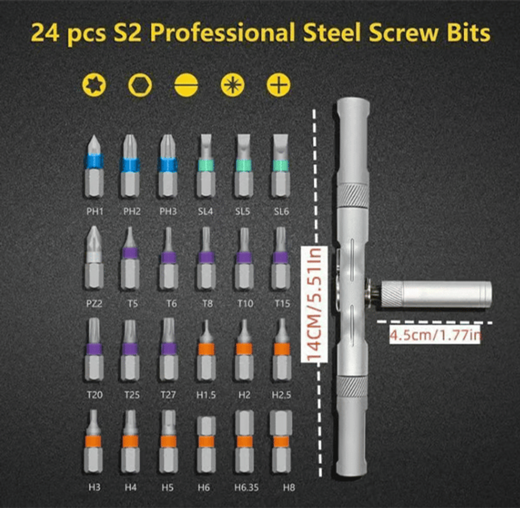 【Magnetic Precision】: Contains 24 magneticscrewdriver bits, ensuring a firm grip on screws for aseamless maintenance experience.
