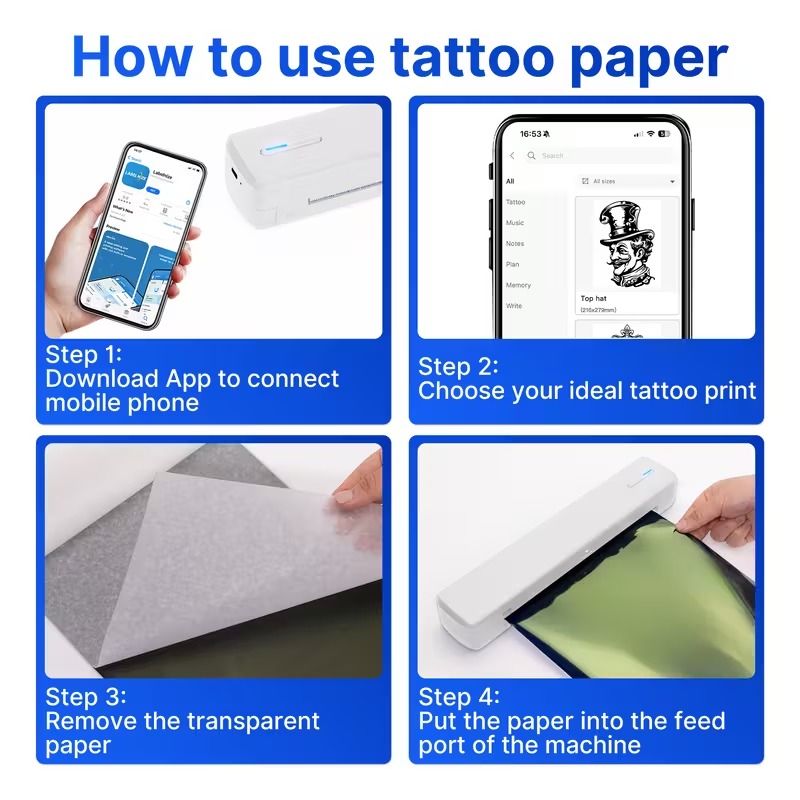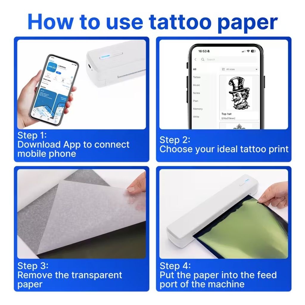 【Inkless Printing】Inkless portable thermal printer use thermal direct technology, which allows you to no longer rely on separate ink cartridges. Inkless printer is a tattoo stencil printer and supports Thermal Paper and tattoo stencil paper. The thermal printer packaging comes with 20 sheets of US Letter for printing. Notice: The side of the paper with black markings need to faces downwards and install paper which marks “ Paper entry” on Printer. When install paper, remember to switch the paper size switch on the left of the "Paper entry",switch it to 216 (upper) can print US Letter Paper, to 210 (bottom) can print A4 Paper.
